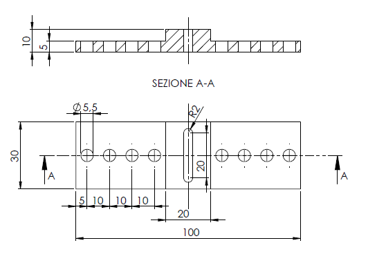 Partendo da un materiale grezzo di dimensioni 100x30 h10 scrivere il programma di lavorazione necessario ad ottenere il prodotto finito in figura. Gli utensili che si possono utilizzare sono: